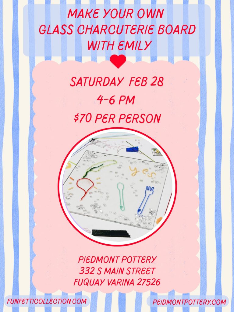 Create your own custom charcuterie board! You will learn how to manipulate thin rods of glass over a candle flame and collage precut and crushed glass to bring your own design to life! The small class size of 5 people allows for plenty of hands-on instruction and quiet conversation. Each student will design their own 8”x8” glass tray which will be fired after class to be picked up in 1-2 weeks. Register now to save your spot!